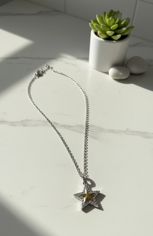 Gökyüzünün ışıltısını stilinize taşıyın! Gold ve silver uyumuyla tasarlanmış, zarif yıldız detayıyla kombinlerinize şıklık katıyor. Günlük kullanım veya özel anlar için ideal.
